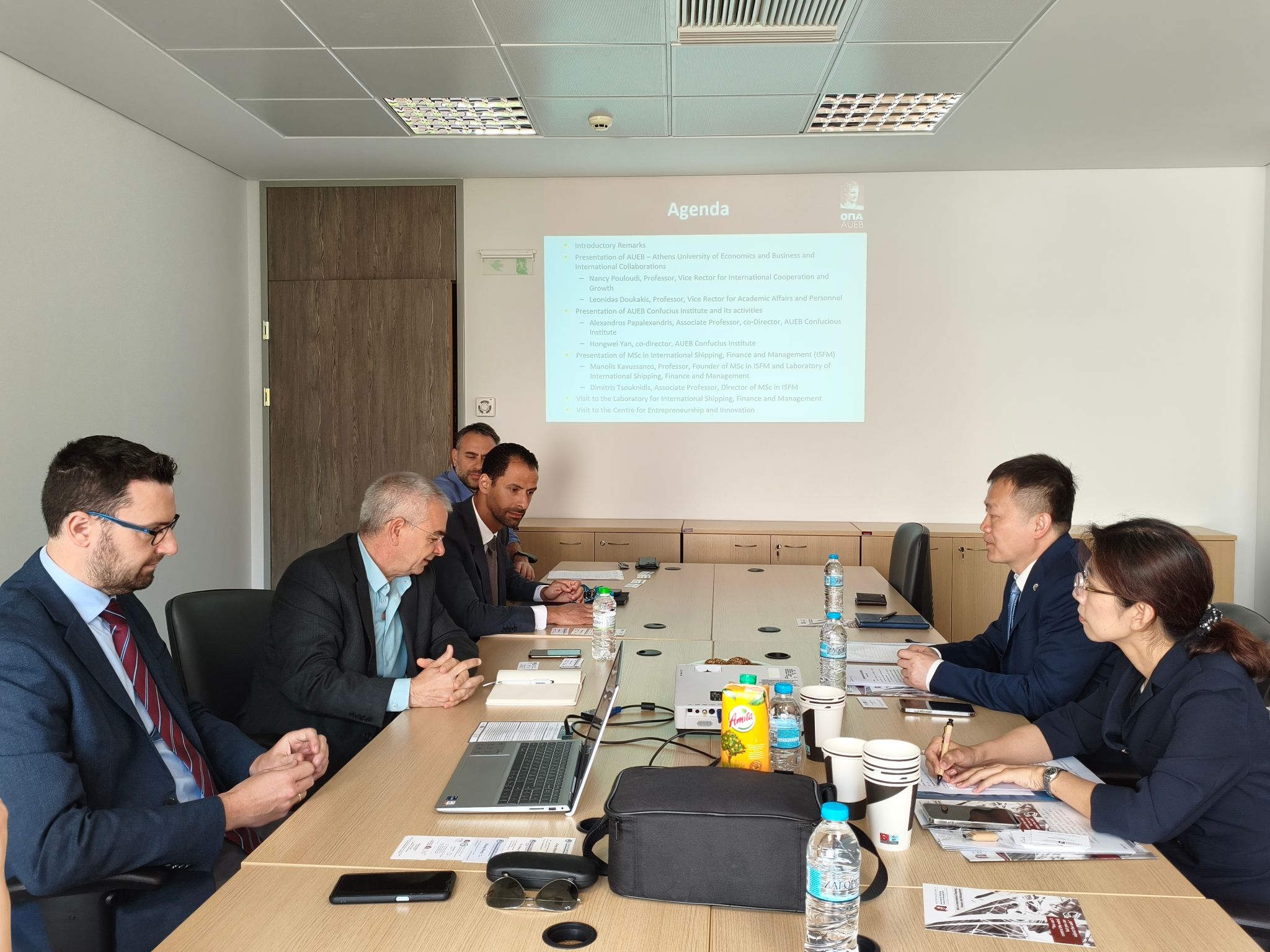 在雅典大学,曾庆成与该校经济与社会科学学院院长Nikolaos Iriotis进行会谈。曾庆成介绍了我校基本情况以及航运经济、港口物流等领域的人才培养、科学研究情况。他表示希望两校建立合作关系,在博士生联合培养、教师访学、共同申报国际科研项目等领域开展合作。Nikolaos Iriotis表示雅典大学是希腊最古老、最具影响力的高等学府,与我校在航运经济专业具有较大合作潜力,希望两校优势互补,尽早在学生交流、教师互访、联合科研等领域开展务实合作。