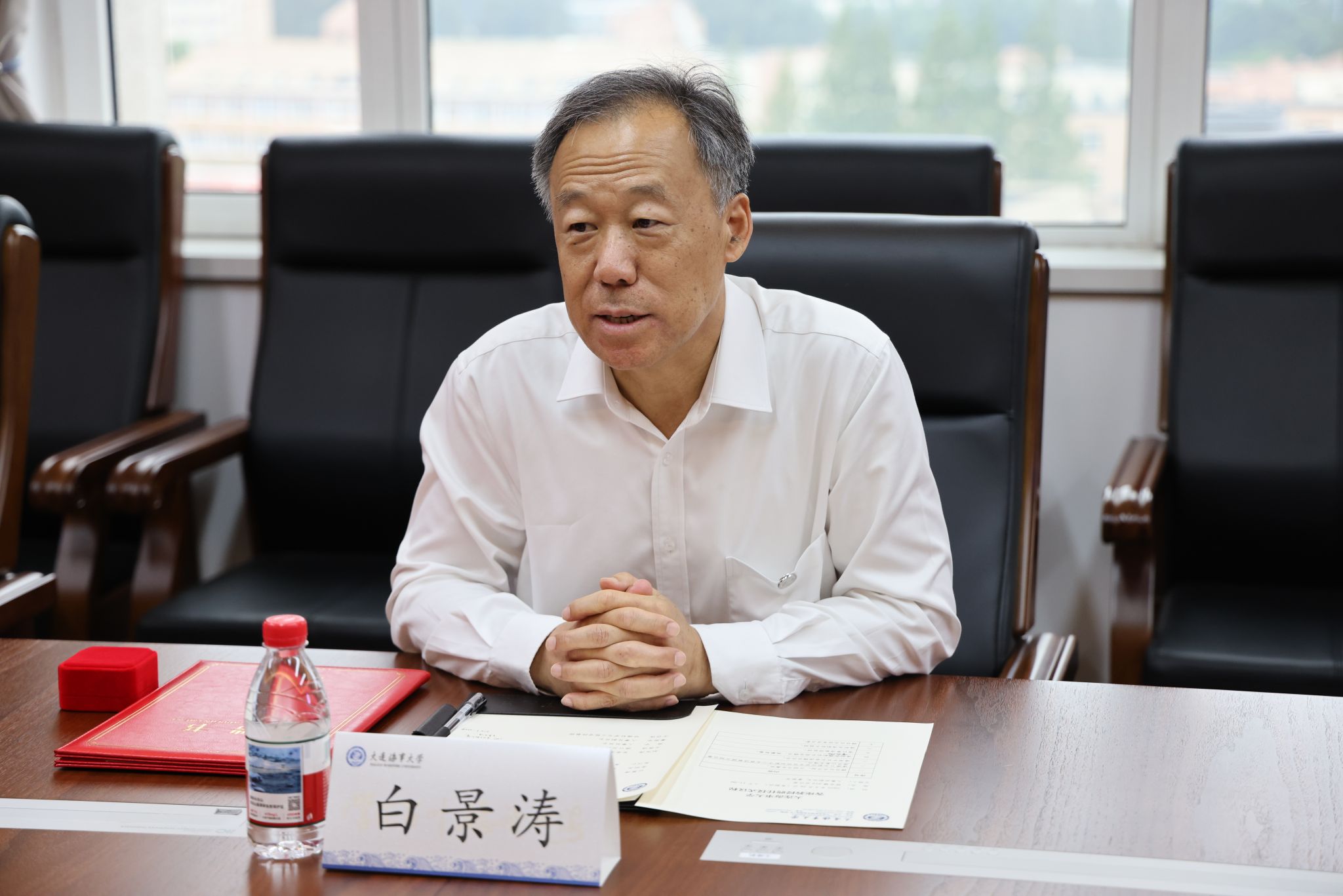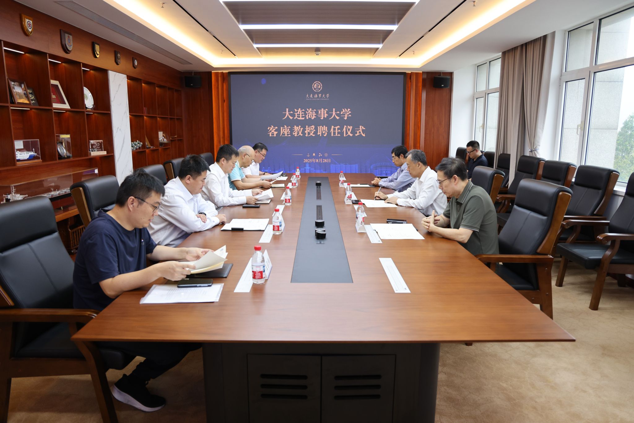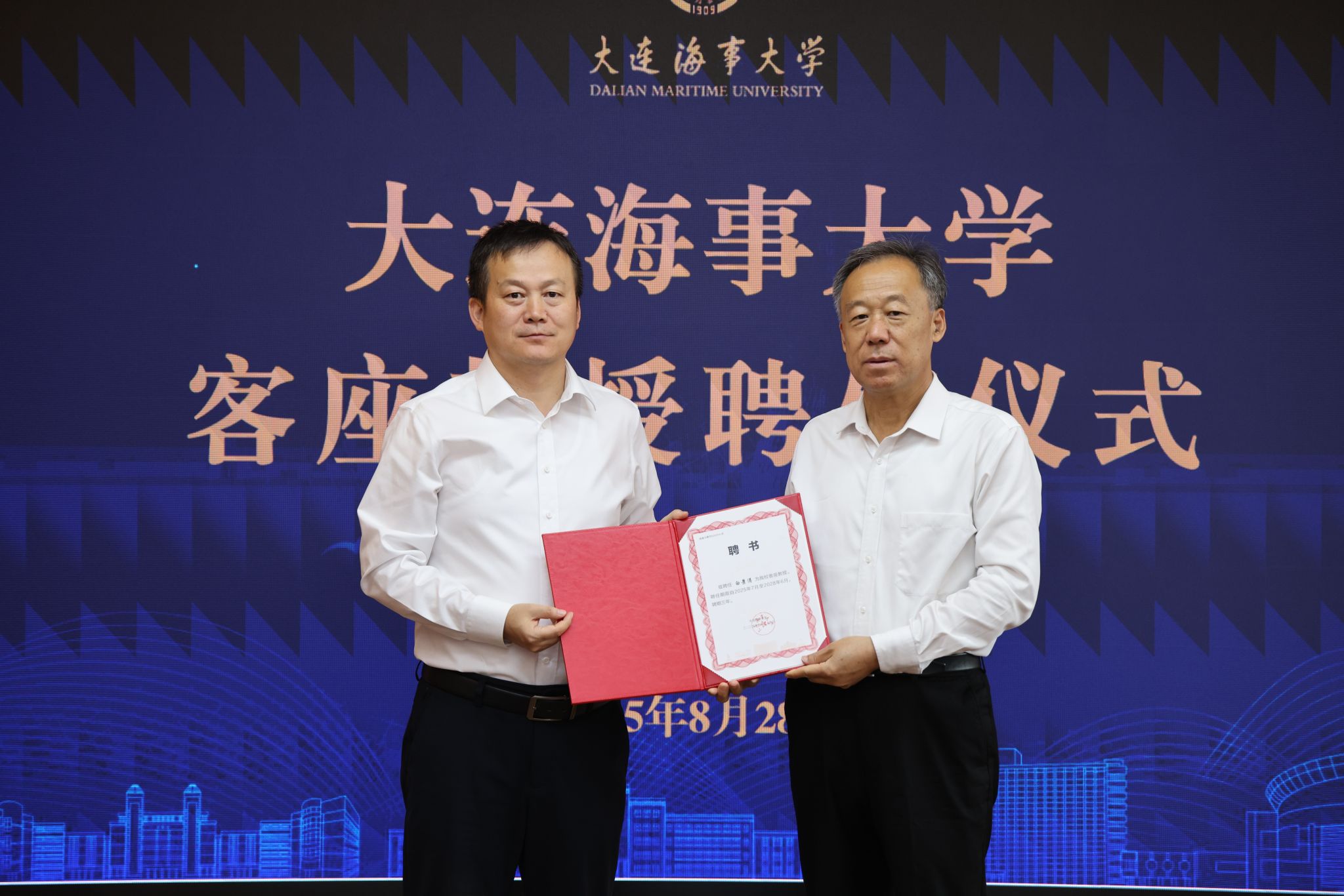 8月28日上午,招商局公路网络科技控股股份有限公司(招商公路)原党委书记、董事长白景涛受聘大连海事大学客座教授仪式在综合楼920会议室举行。副校长曾庆成出席聘任仪式并为白景涛颁发聘书、佩戴校徽。