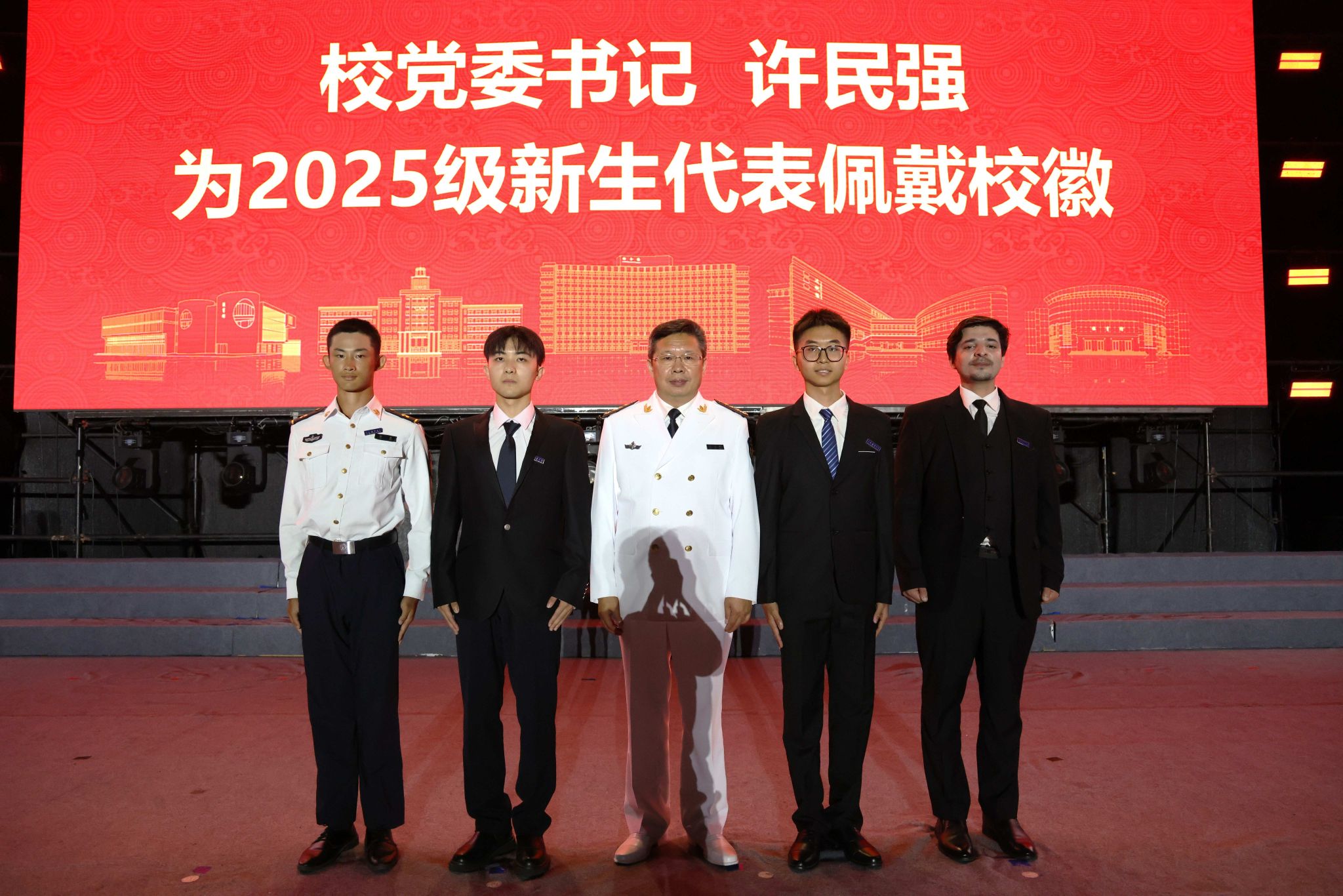 校党委书记许民强为2025级新生代表宁浩源、程鑫、贾文轩、哈菲兹安华佩戴校徽,现场2025级同学们统一佩戴校徽。校徽是大学精神和校园文化的浓缩,从这一刻起,“海大人”成为他们共同的名字;从这一刻起,海大的精神与文化将深深融入他们的血脉。2025级同学们将传承“学汇百川 德济四海”的海大校训,共同承担起时代赋予的责任与担当。
