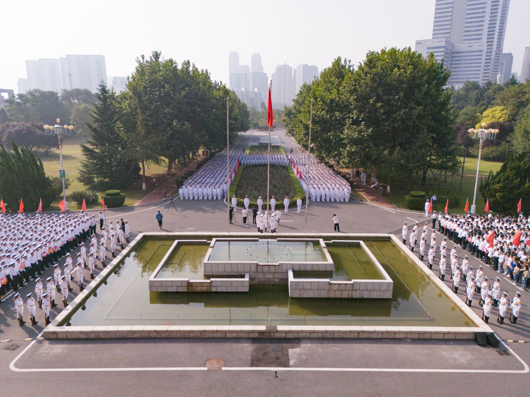 上午9时,参加升国旗仪式的师生、校友在综合楼前肃穆而立。国旗护卫队英姿飒爽,迈着铿锵的步伐,护卫着五星红旗走向升旗台。