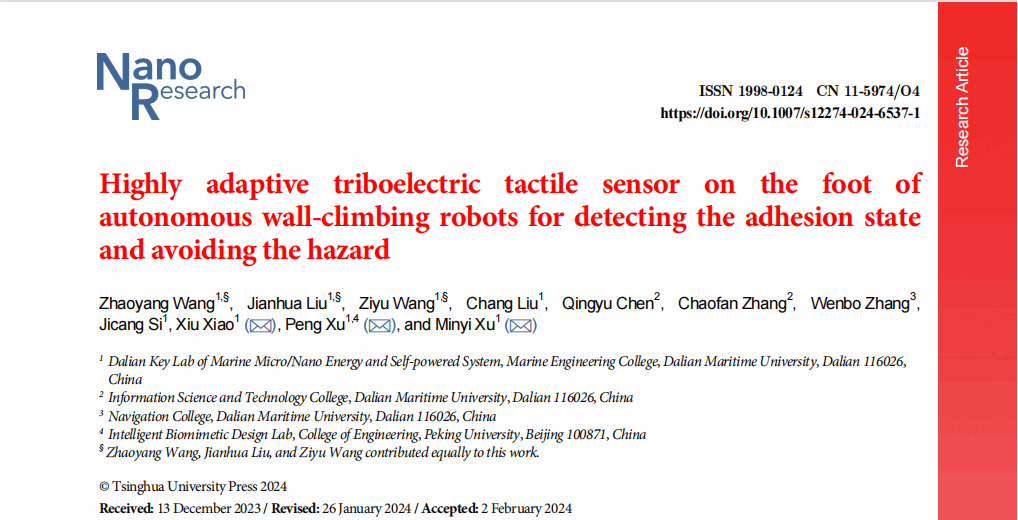 近日,轮机工程学院徐敏义团队在《Nano Research》上发表最新研究论文"Highly adaptive triboelectric tactile sensor on the foot of autonomous wall-climbing robots for d...