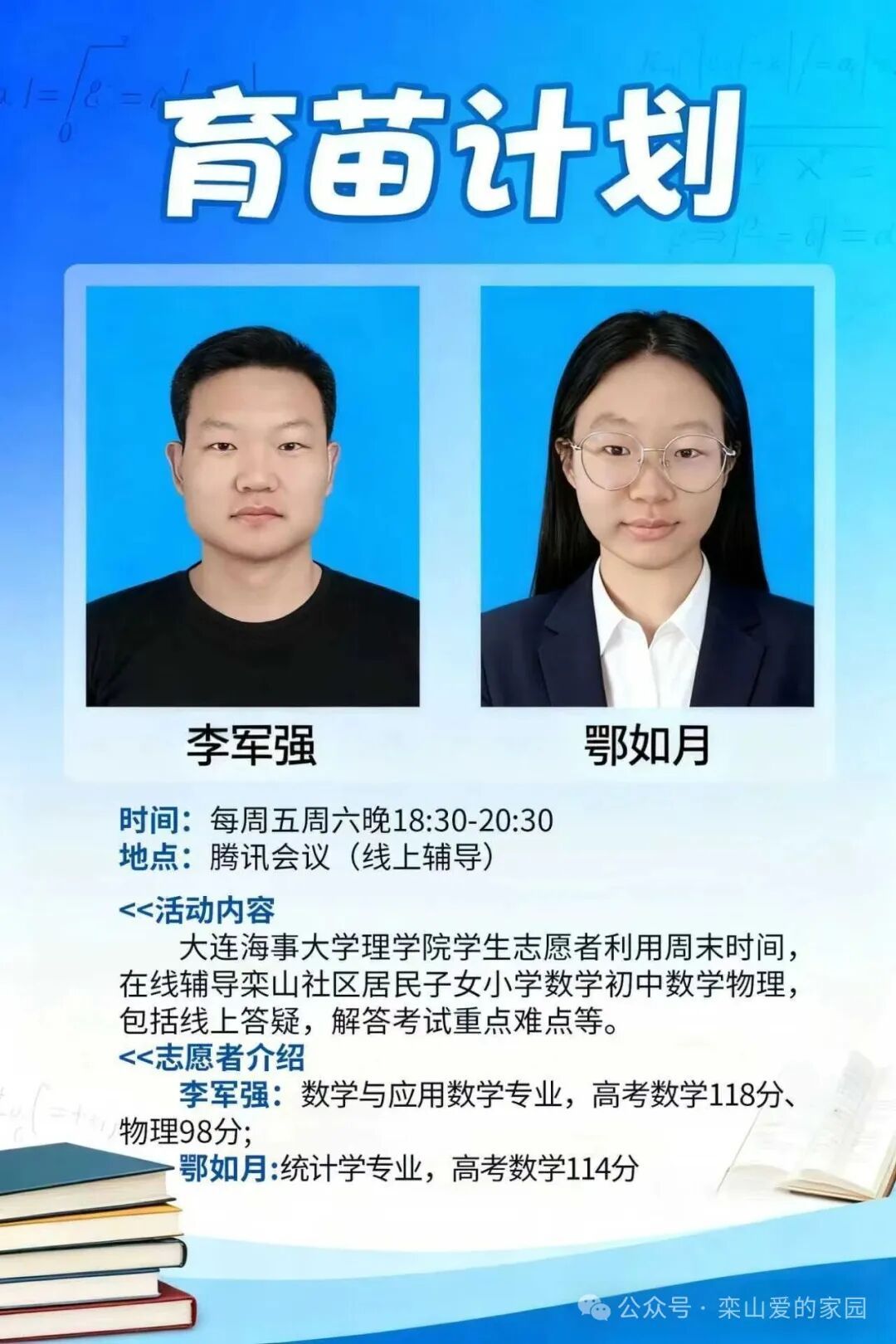 为深化党建引领基层治理,帮助栾山社区部分小学初中学生解决数学、物理学科学习困难,11月7日晚,大连海事大学理学院本科生党支部与高新园区凌水街道栾山社区联合开展的“育苗计划”于正式启动。本次活动通过腾讯会议平台为社区中小学生提供数学、物理学科答疑辅导,首场活动吸引了栾山社区学生与家长积极参与,展现出社区对教育支持的高度热情。理学院本科生党支部三名志愿者作为指导教师,对学生提出的典型问题进行了耐心解答。志愿者通过语音讲解、...