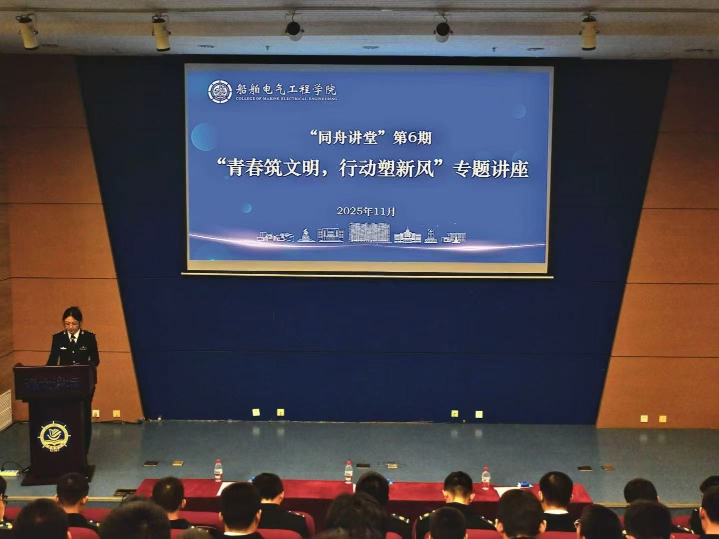 为深入贯彻立德树人根本任务,进一步涵养优良校风学风,筑牢校园文明根基,营造崇德向善、笃行致远的校园风尚,11月26日,船舶电气工程学院在海大展馆报告厅举办“同舟讲堂”第6期——“青春筑文明,行动塑新风”专题讲座。学院党委副书记、副院长、纪委书记王超,2025-1中队思政课兼职指导员孙大鹏,2025-2中队思政课兼职指导员隋艺,学院学生工作干部,2025级全体新生参会。本次会议由船舶电气工程学院2025-2中队指导员李爽主持。...