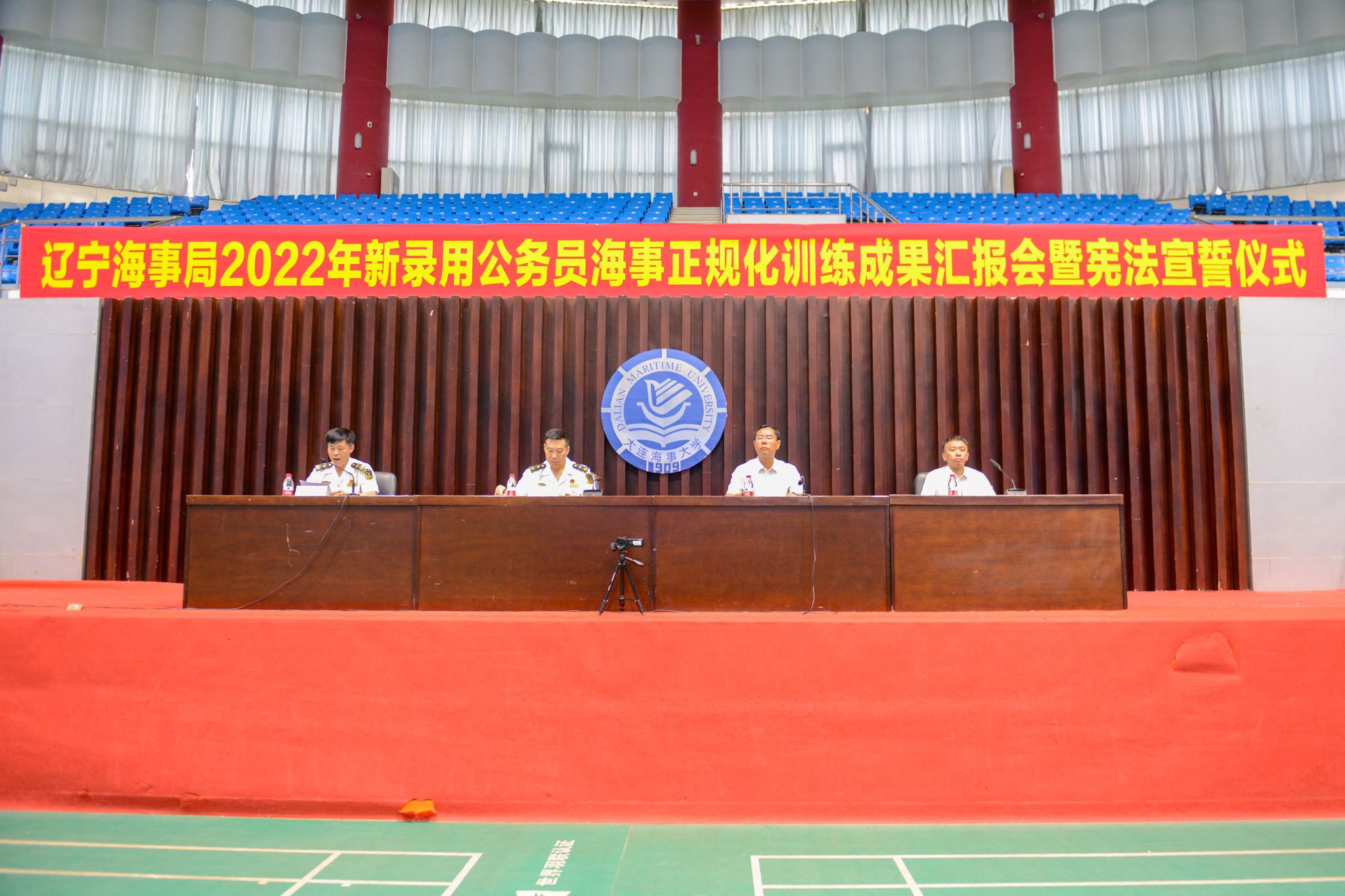 6月19日上午,辽宁海事局2022年新录用公务员正规化训练成果汇报暨宪法宣誓仪式在我校体育馆举行,辽宁海事局副局长刘力、大连海事大学纪委书记罗钟山、辽宁海事局技能训练中心主任王铁龙、大连海事大学交通运输高级研修学院副院长赵刚等出席,会议由王铁龙主持。会议在整齐划一的成果汇报中拉开序幕。学员们步伐铿锵、军容严整,精神饱满、斗志昂扬,展示了良好的军事素质和意志品质。成果汇报结束后,罗钟山与刘力分别致辞。罗钟山对本次辽宁海事局与海事大学的又一次圆满合作表示祝贺,...